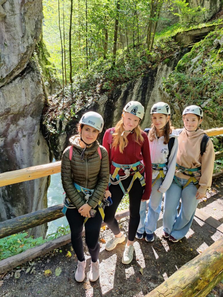 Sie zeigten uns nicht nur, wie man die Klettergurte für den Flying Fox richtig anlegt, sondern vermittelten auch interessante Informationen über die Salzach sowie über die Entstehung und Geschichte der Klamm. So erfuhren wir außerdem, dass der Wasserspiegel früher deutlich höher lag, wodurch schon die Neandertaler dort erfolgreich fischen konnten. Heute hingegen prägen steile Felswände und mächtige Kalkschichten das Landschaftsbild. Darüber hinaus hörten wir geheimnisvolle Sagen über Teufelsspuren und erfuhren von den gefährlichen Strömungen, die KajakfahrerInnen in große Gefahr bringen können.