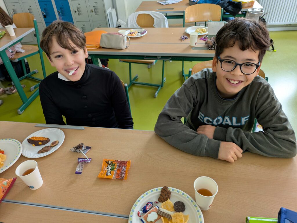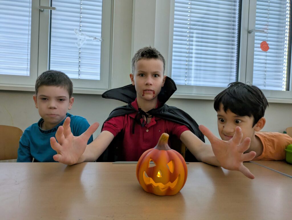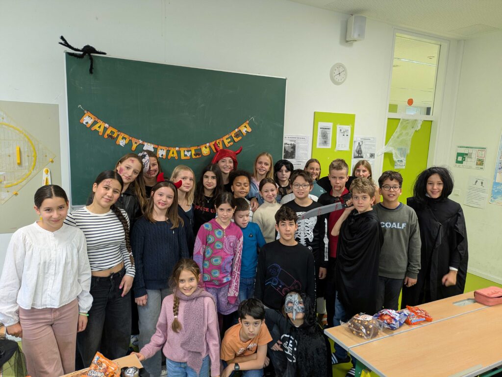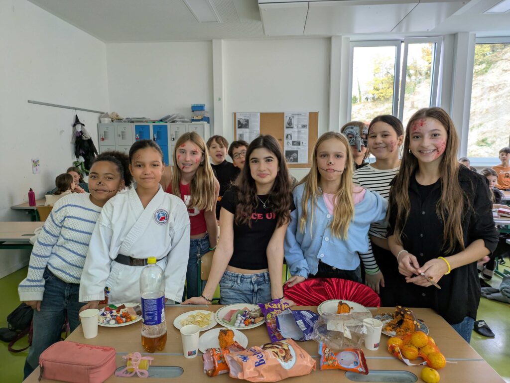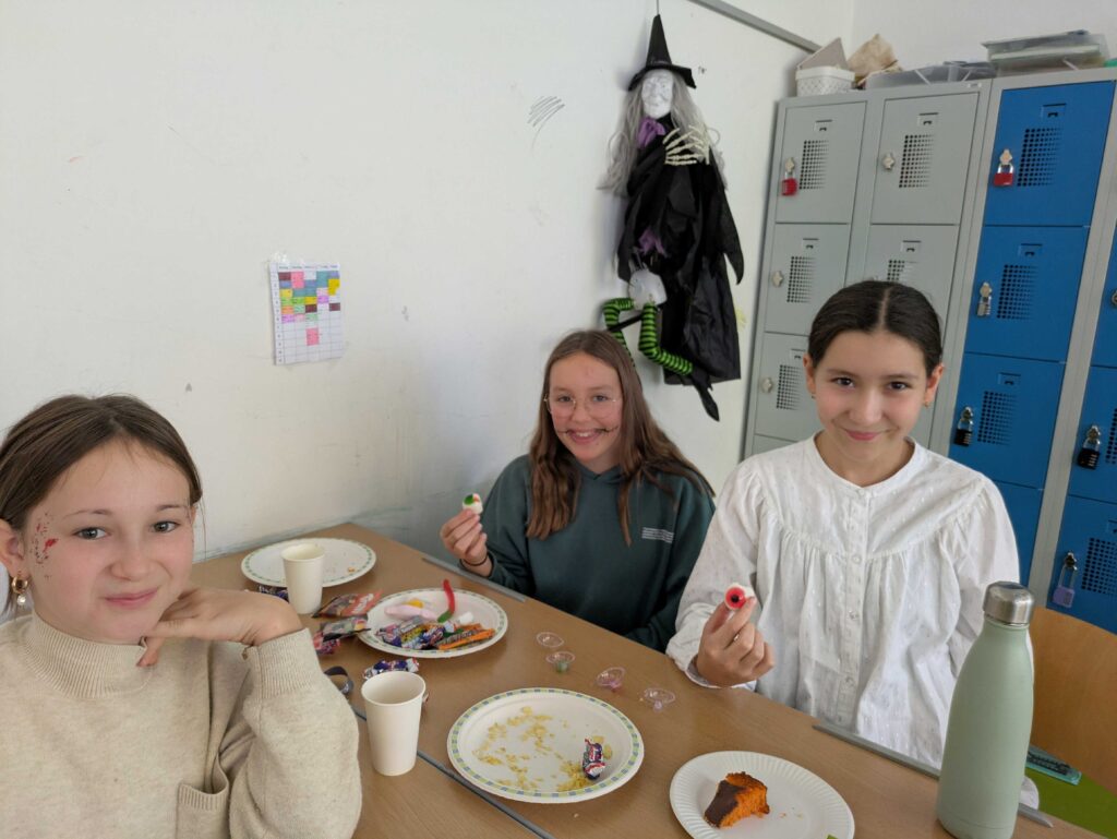 After dealing with Halloween in English, class 2e celebrated a Halloween party with delicious sweet and savoury food, cool drinks and fun party games. The classroom was decorated with scary skeletons, spiders and pumpkins and everyone enjoyed the party!