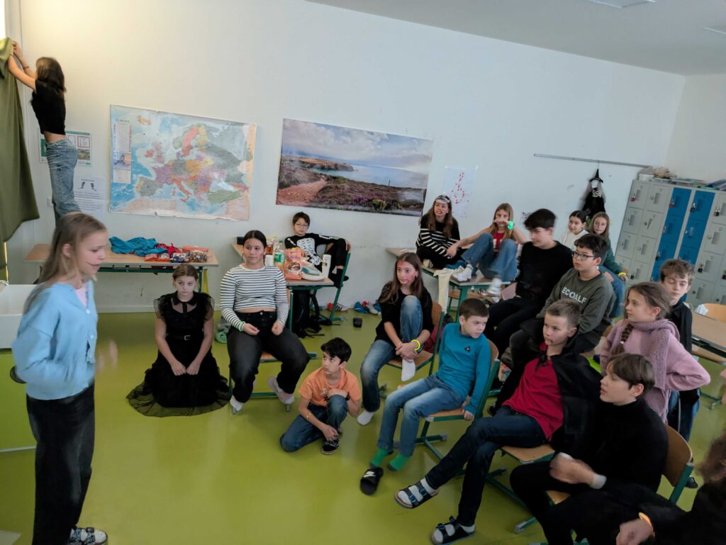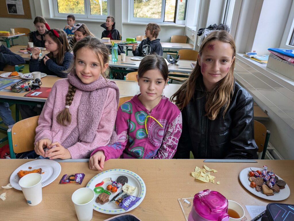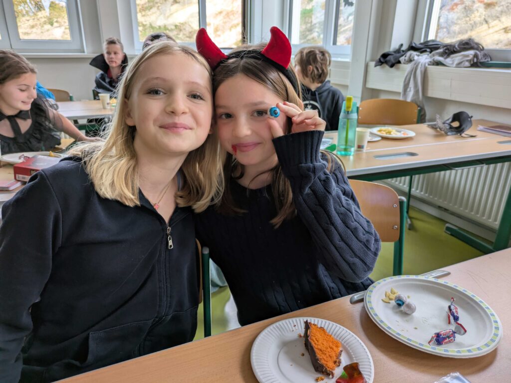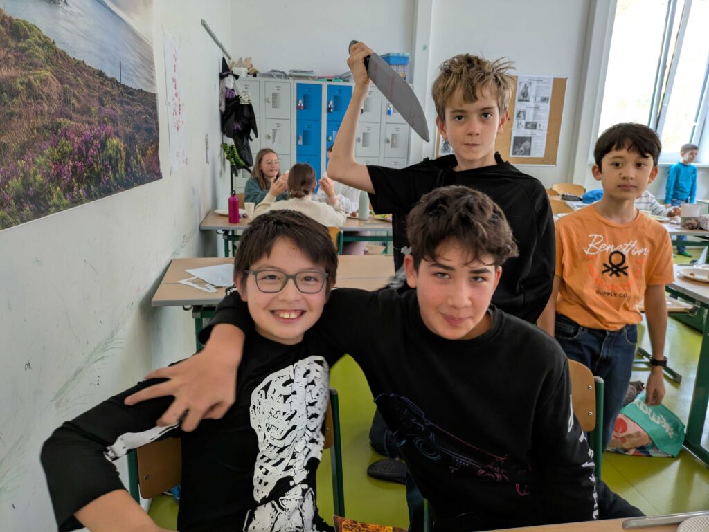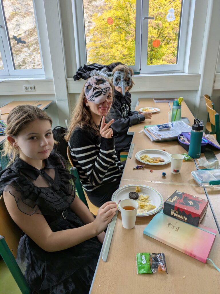 After dealing with Halloween in English, class 2e celebrated a Halloween party with delicious sweet and savoury food, cool drinks and fun party games. The classroom was decorated with scary skeletons, spiders and pumpkins and everyone enjoyed the party!
